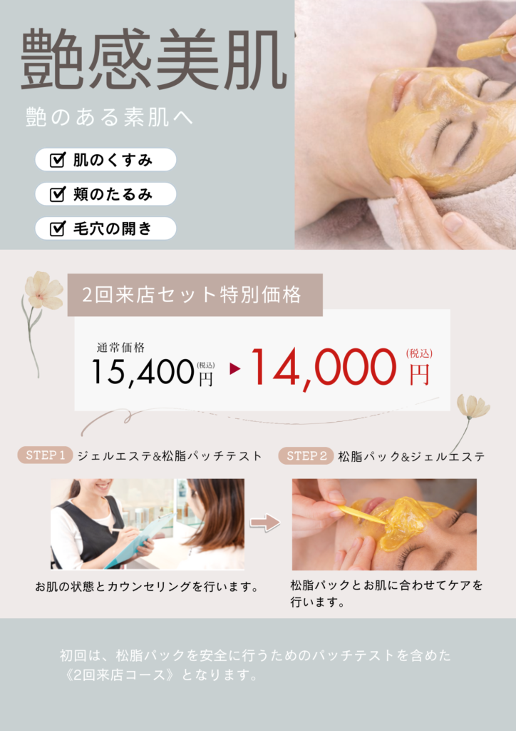 ※初回は、松脂パックを安全に行うため、パッチテストを含めた《2回来店コース》となります。
