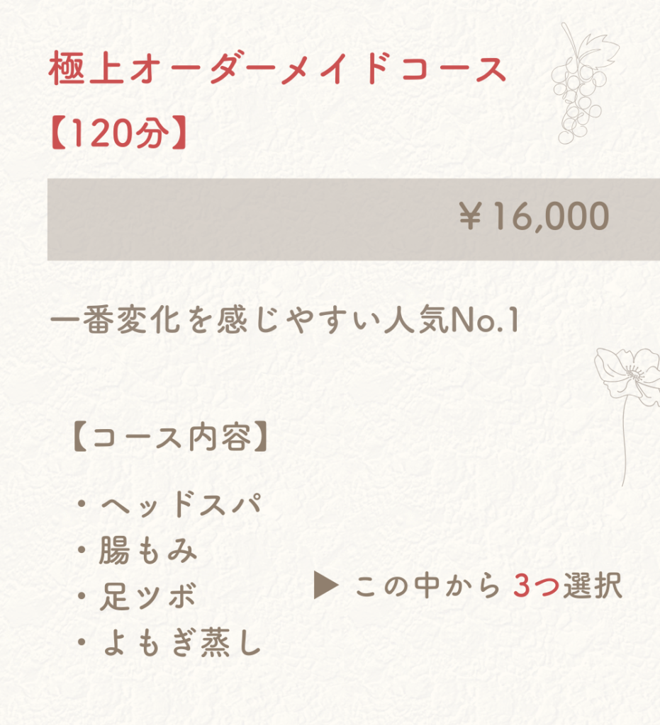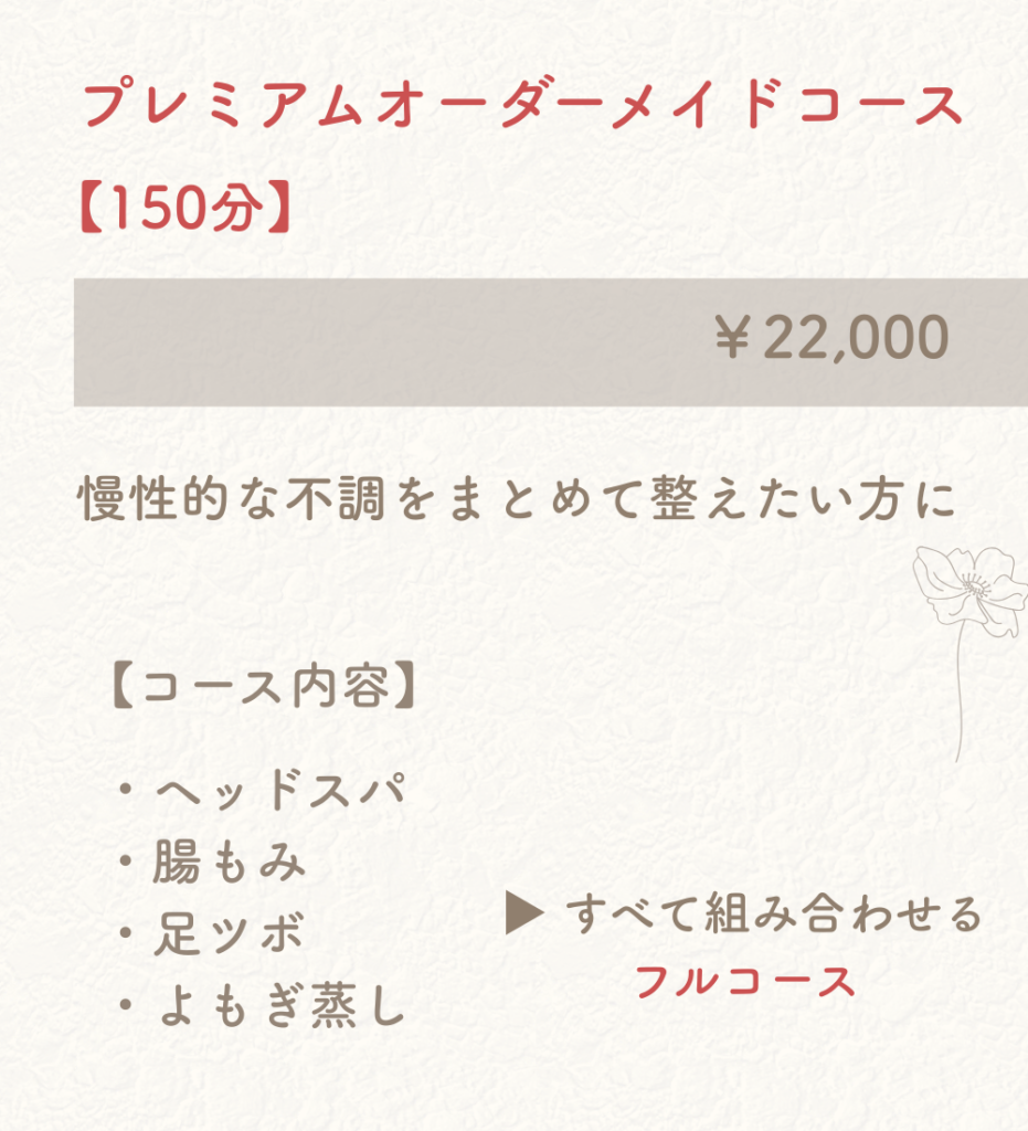 当サロンでは、その日の身体の状態に合わせて施術を組み合わせるオーダーメイドのボディケアを行っています。